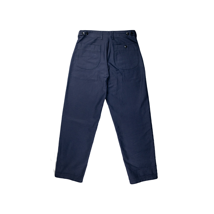 전체적인 팬츠의 틀은 50년대 미군의 퍼티그팬츠를 기반으로 레귤러핏의 실루엣과 허릿단이 없는 형태이며